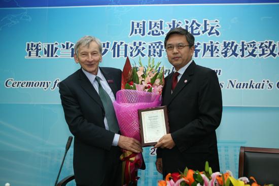 罗伯茨爵士感谢南开大学的热情欢迎,他表示,南开大学在国际关系领域有一批非常优秀的学者,自己的著作《全球治理——分裂世界中的联合国》经南开学者翻译成中文,并在他们帮助下修正了其中的一些内容,他对此表示非常感谢。他说,南开作为周恩来总理的母校,培养了大批优秀的人才,很荣幸能够成为南开的客座教授,希望能为两校乃至两国间的教育、文化交流作出努力。