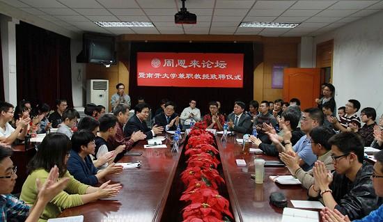 10月12日,北京大学国际关系学院院长、中国国际关系学会副会长王缉思教授受聘南开大学兼职教授并做客“周恩来论坛”,南开大学副校长佟家栋向王缉思致送聘书并佩戴校徽。活动由8bo8即时比分