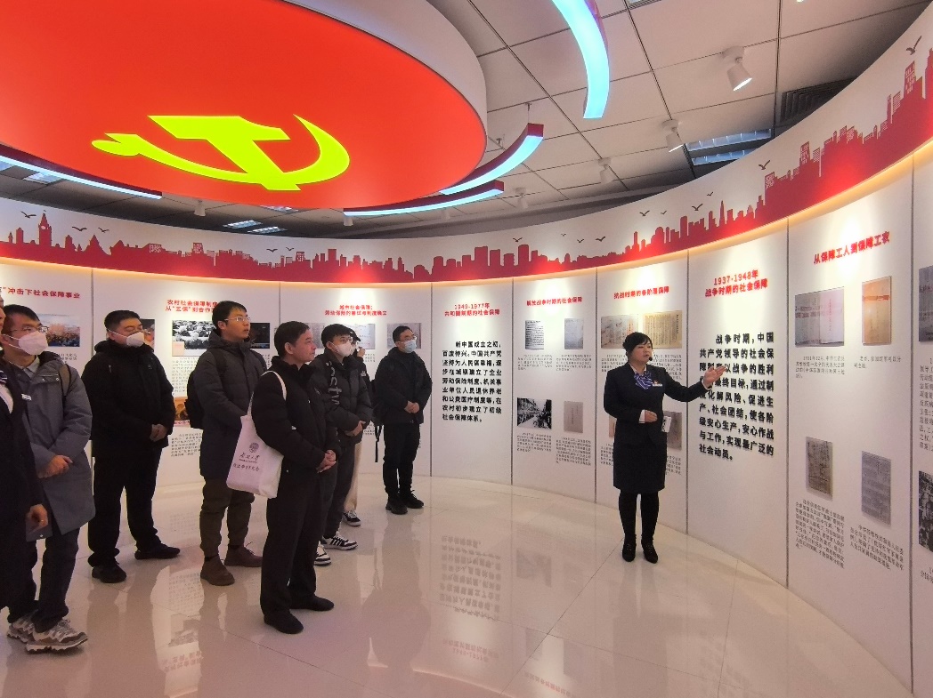 程同顺教授一行首先参观了天津市社保陈列展,在场馆工作人员的介绍下详细了解了天津市社会保险制度的发展历程、各个阶段社会保障工作取得的突出成果以及档案管理、组织建设等方面的创造性举措。天津市社会保险基金管理中心办公室主任张健同志对南开大学团队的到来表示热烈欢迎,并在参观的过程中就天津市社保工作特色与程同顺教授展开交流。