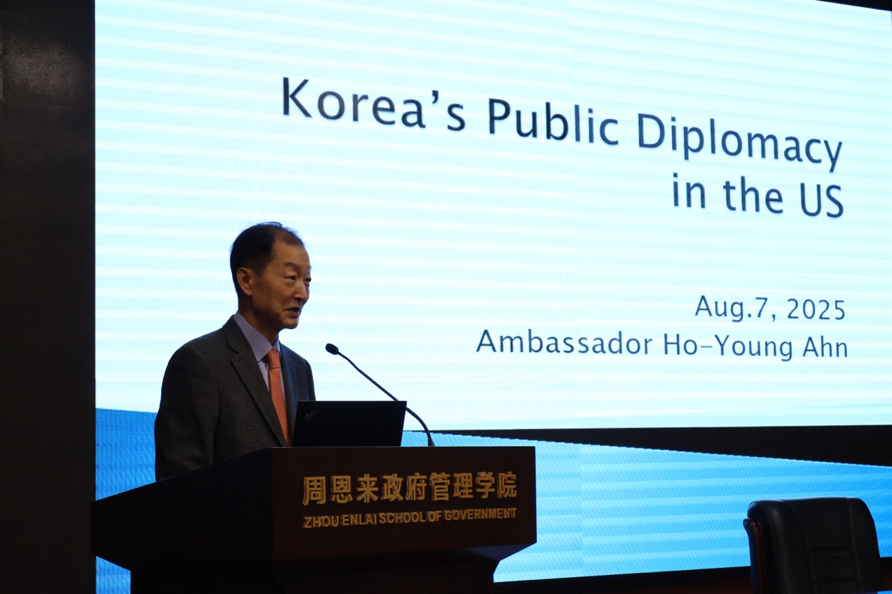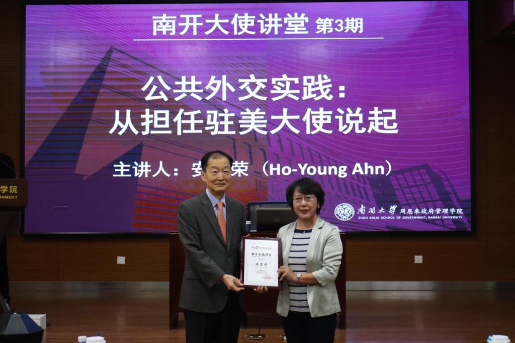 “南开大使讲堂”第3期于政府管理学院128报告厅举行。韩国前驻美大使安豪荣以“韩国在美国的公共外交”为主题,为全校师生带来一场精彩的讲座。政府学院党委书记王慧研究员、南开大学图书馆馆长韩召颖教授、副院长张发林教授等老师出席。本次讲座由政府学院副院长张发林教授主持。