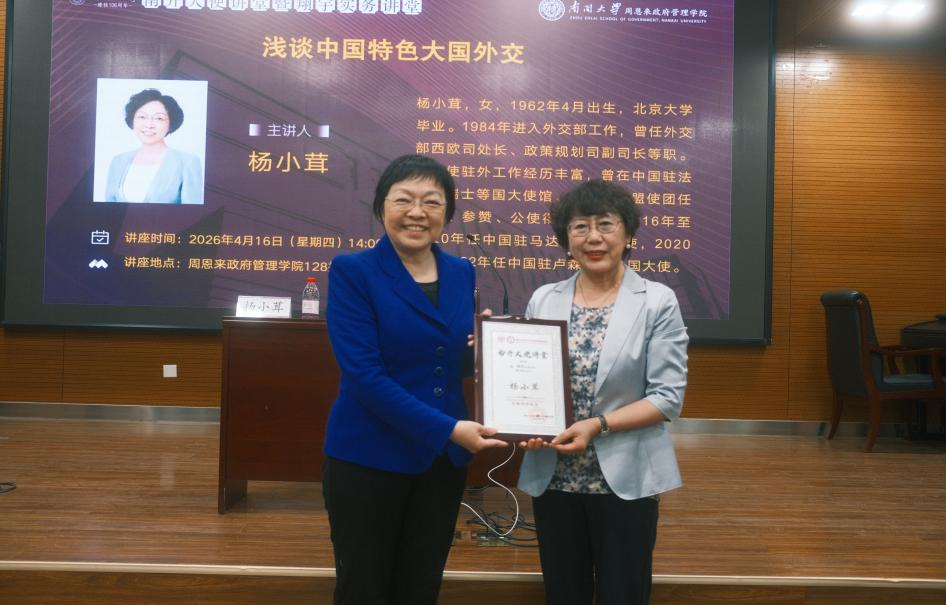 讲座伊始,党委书记王慧为杨大使颁赠了“南开大使讲堂第4期”主讲纪念奖牌。杨小茸大使于1984年进入外交部工作,曾任外交部西欧司处长、政策规划司副司长,并在中国驻法国、瑞士大使馆及中国驻欧盟使团长期任职,2016年至2020年任中国驻马达加斯加大使,2020年至2022年任中国驻卢森堡大公国大使,外交实践经验丰富。