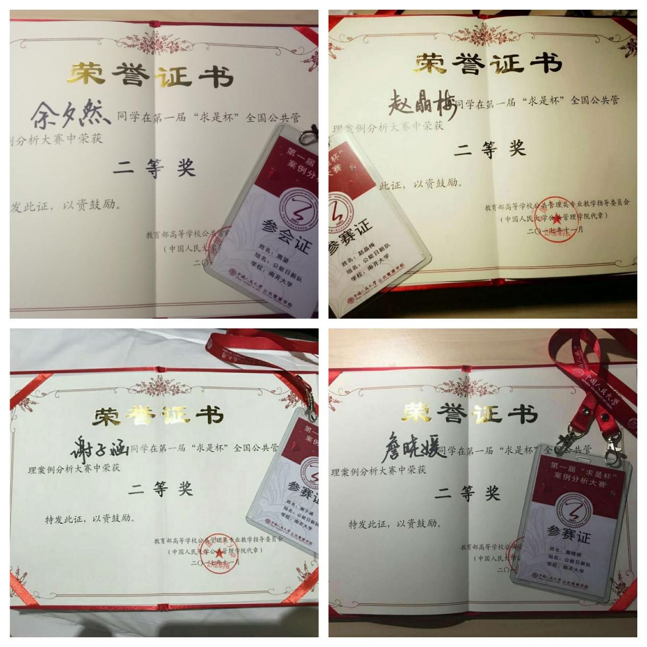 2015级行政管理专业本科生余夕然、赵晶梅、詹晓媛和2014级城市管理专业本科生谢子涵组成的“公能日新”代表队,在行政管理系周望老师的指导下,与全国260多支参赛队伍展开激烈竞争,经历初赛、复赛、决赛,最终获得赛事二等奖的佳绩。