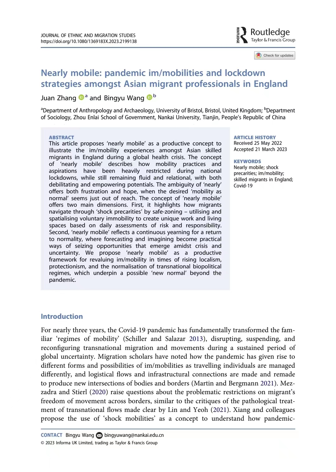 社学系王炳钰教授(作为通讯作者)与布里斯托大学人类学与考古学系张娟副教授的最新合作文章于2023年4月12日在线发表于移民和族群研究顶刊Journal of Ethnic and Migration Studies (JEMS),文章题为Nearly mobile: pandemic im/mobilities and lockdown strategies amongst Asian migrant professionals in England。所发表期刊JEMS为英文核心期刊(SSCI)一区刊物(Journal Citation Reports-Q1);作为移民研究国际权威刊物,JEMS在JCR“族群研究”与“人口学”两个类别均排名世界第1,在谷歌学术“移民研究”和“社会学”两个类别的世界排名分别为第1和第2。本期推文将对这篇文章的研究问题、研究发现以及主要贡献进行介绍。