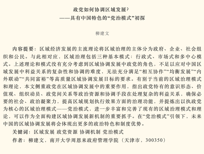 柳建文教授在2024年第3期的《政治学研究》发表文章《政党如何协调区域发展——具有中国特色的“党治模式”初探》。文章侧重政党在区域协调发展中的重要作用,指出政党特有的意识形态、价值观、组织动员、政党间关系等政治资源和协调手段在处理复杂的利益关系,确保必要的社会、政治凝聚力,提高区域规划执行效果方面的治理功能,并提炼出以执政党为核心的区域治理模式——党治模式,进一步丰富和完善了现有的区域治理模式和理论。