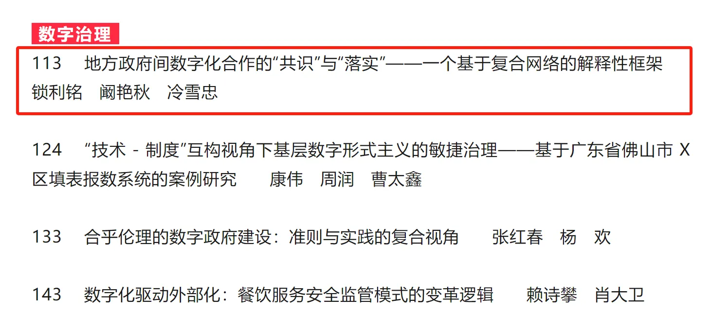 日前,《中国行政管理》期刊公布了2024年第7期目录。学院锁利铭教授以及博士生阚艳秋、冷雪忠所撰写的《地方政府间数字化合作的“共识”与“落实”——一个基于复合网络的解释性框架》一文获得发表。