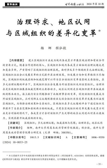 杨娜教授等在《世界经济与政治》发文研究区域组织多元治理议题