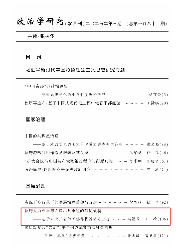 教授、中国政府发展联合研究中心研究员赵聚军以及南开大学中国政府发展联合研究中心研究助理王坤撰写的《政府人力成本与人口小县重组的最优规模——基于东北三省的可解释机器学习分析》一文获得发表。