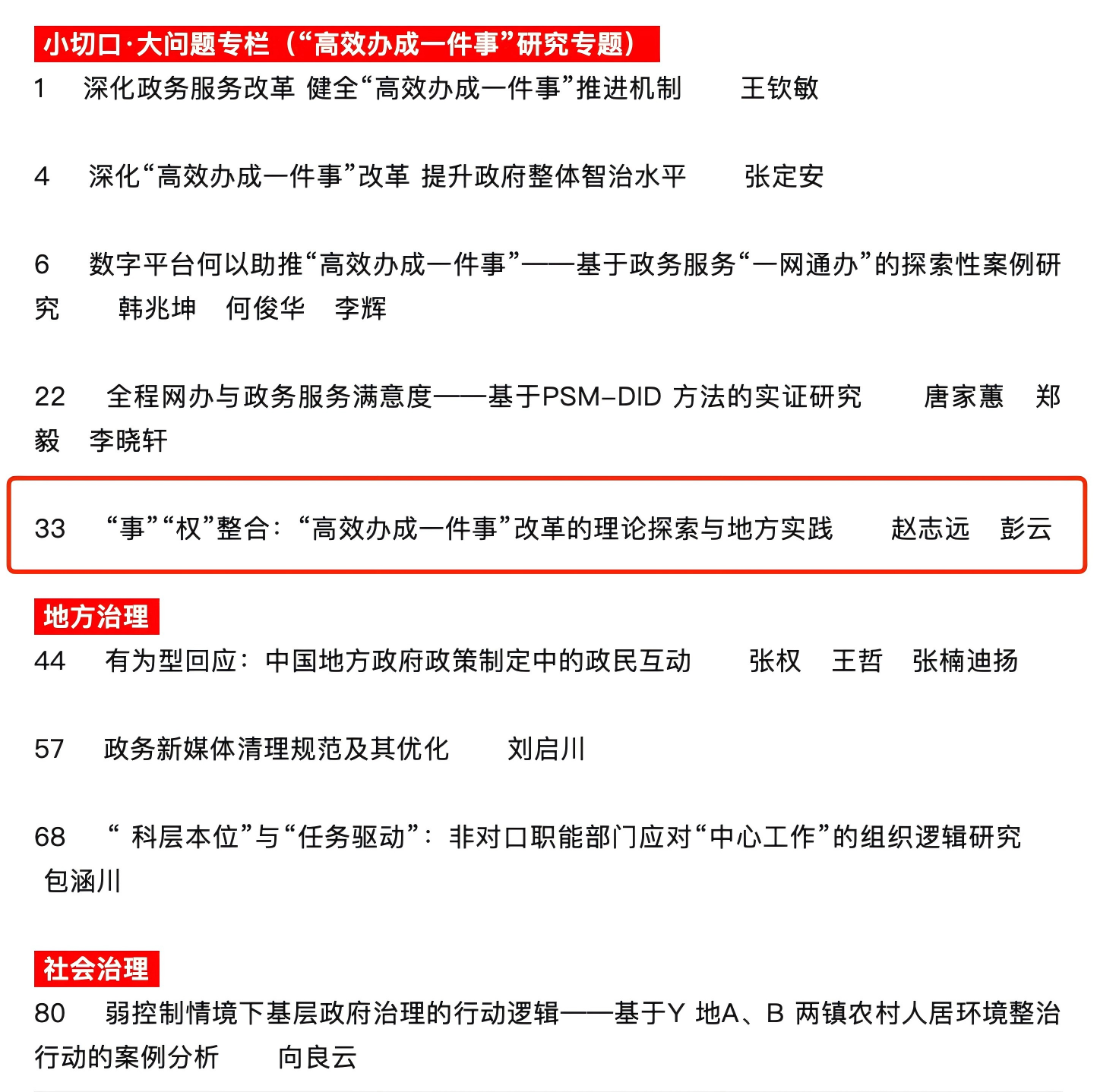 讲师、中国政府发展联合研究中心研究员赵志远与中国行政管理学会副研究员彭云合作撰写的《“事”“权”整合:“高效办成一件事”改革的 理论探索与地方实践》一文获得发表。