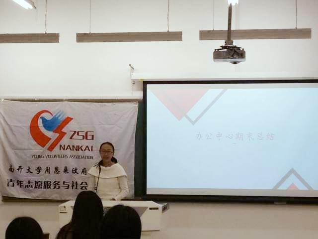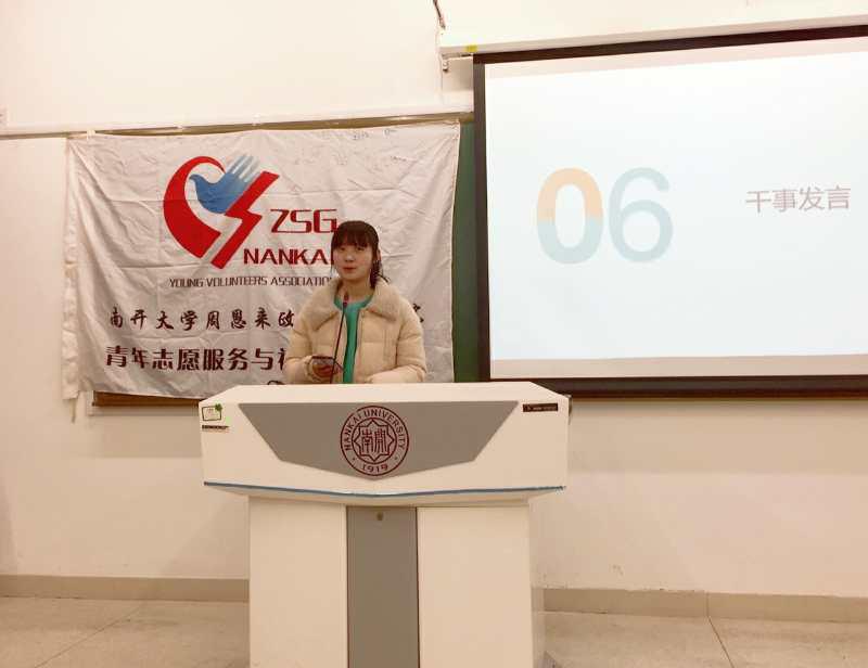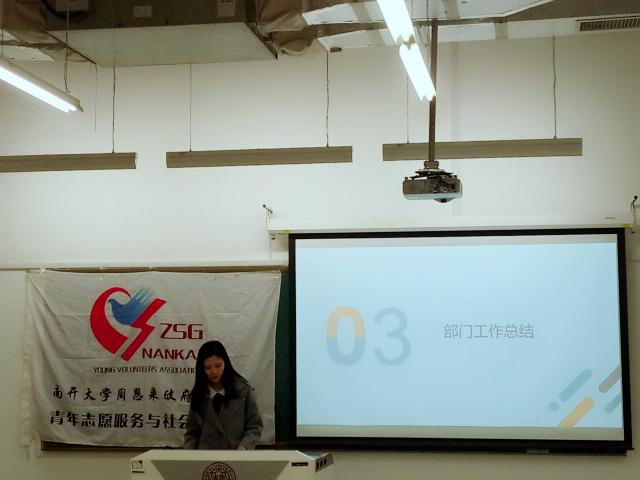 观看视频之后,部长曹萌进行了总结发言。部长首先对志实部这学期的工作做了点评和总结。志实部在本学期荣获“南开大学优秀志愿服务集体”称号;所申报的“创未教育训练指导中心”项目获得了“优秀志愿服务基地”称号;在志愿服务工作年终考评中也取得良好成绩。最后,部长对下学期工作进行了规划和安排,指出本部将继续践行“用生命影响生命,用脚步改变人生”的理念,为社会做出更多的贡献。