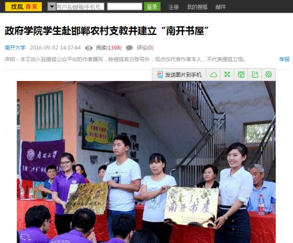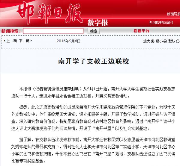 十名学生赴河北省邯郸市永年县永合会镇王边村联合学校开展大学生暑期社会实践活动。此次活动以“莘莘学子传支教美德,情系乡土扬公能精神”为主题,进行为期十天的支教。在为小学生开设课程的同时,实践队员们还完成了课题调研、建立南开书屋、建设社会实践基地等任务。此次活动是南开学子知行合一的良好实践,积极响应“精准扶贫”国家政策要求,极大地促进了文化、科技、卫生“三下乡”事业发展,受到了搜狐新闻、凤凰资讯、邯郸电视台、邯郸日报与邯郸晚报等多家媒体的关注与报道,下附部分报道截图。