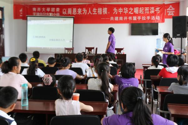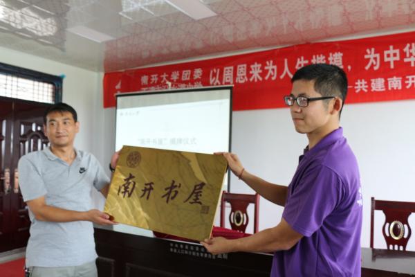 接下来,堰口镇组织委员邸云功致辞,他介绍了堰口镇当前的主要情况,表达了对恩来精神展演团来淮的热切欢迎与对“爱心暑托班”的殷切期望。在团市委组织部部长王芳宣布暑期支教活动正式启动后,南开大学兼职辅导员杨铭与邸云功委员为“南开书屋”揭牌。