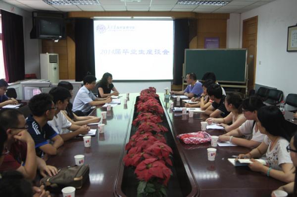 2014届毕业生座谈会在范孙楼116召开。学院党委书记王慧、院长吴志成、党委副书记兼副院长奚先来、团委书记孟杰、辅导员杨晓颖,以及来自各专业的二十余名本科、硕士、博士毕业生代表参加座谈会。
