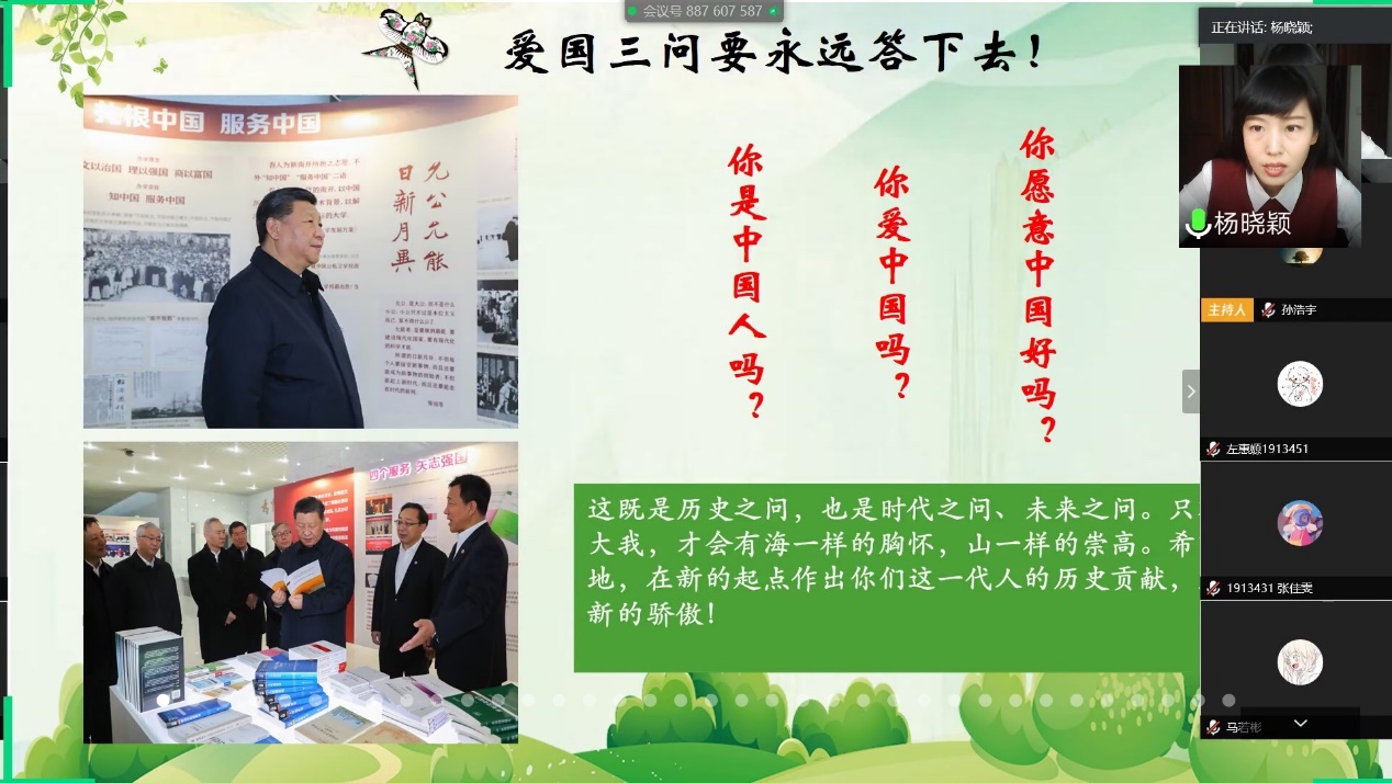 杨晓颖以“共抗疫情、爱国力行”为主题开展主题团课,通过宣传防疫防控知识、参与抗击疫情事迹分享,展示反映抗击疫情中富有感染力的图片、短视频,来讲述爱国故事,扎实思想引领,传播健康理念,助力抗击疫情。“没有人生来就是英雄,总有人用平凡成就伟大!”杨晓颖结合南开学子在疫情期间的志愿服务故事,深情讲述着南开大学传承的深厚的爱国主义情怀和光荣的爱国奋斗传统,在关键时刻站得出、冲得上,以此彰显南开人的责任与担当。
