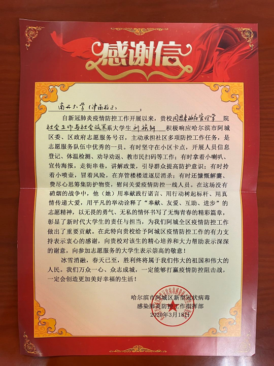 2019级硕士生刘祯妍同学在社区疫情防控工作中做出的突出贡献给予充分肯定和高度评价,同时对南开大学对刘祯妍同学的精心培养和指导帮助表示由衷感谢和崇高敬意。