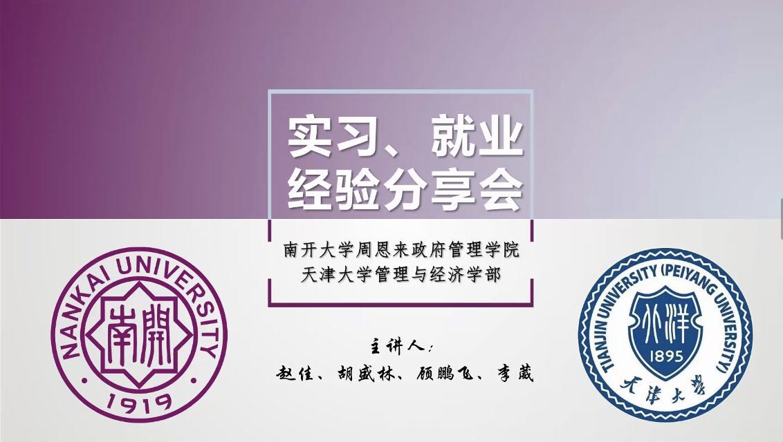 主办,天津大学管理与经济学部协办。本次分享会通过线上视频会议与一对一问答的形式,邀请了两校四位就业实习经验丰富的毕业生进行经验分享,一百五十名学生观看直播。