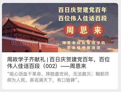坚持全方位育人,从党史学习教育中传承精神。本次活动为期百天,在讲述了100位中国共产党人的历史功绩和感人事迹的同时,旨在鼓励引导学院学子从党员先锋模范的事迹中品读真理的“甜味”、信仰的“纯味”和改革的“辣味”。通过文字、图片及视频等方式打造的全方位宣传模式得到了校内外数千余次的阅读量支持,也极大地鼓舞了周政学子学习先辈们无私奉献、以身报国等伟大精神的热情,坚定了南开人的拳拳报国心和赤诚、深厚的爱国情怀。