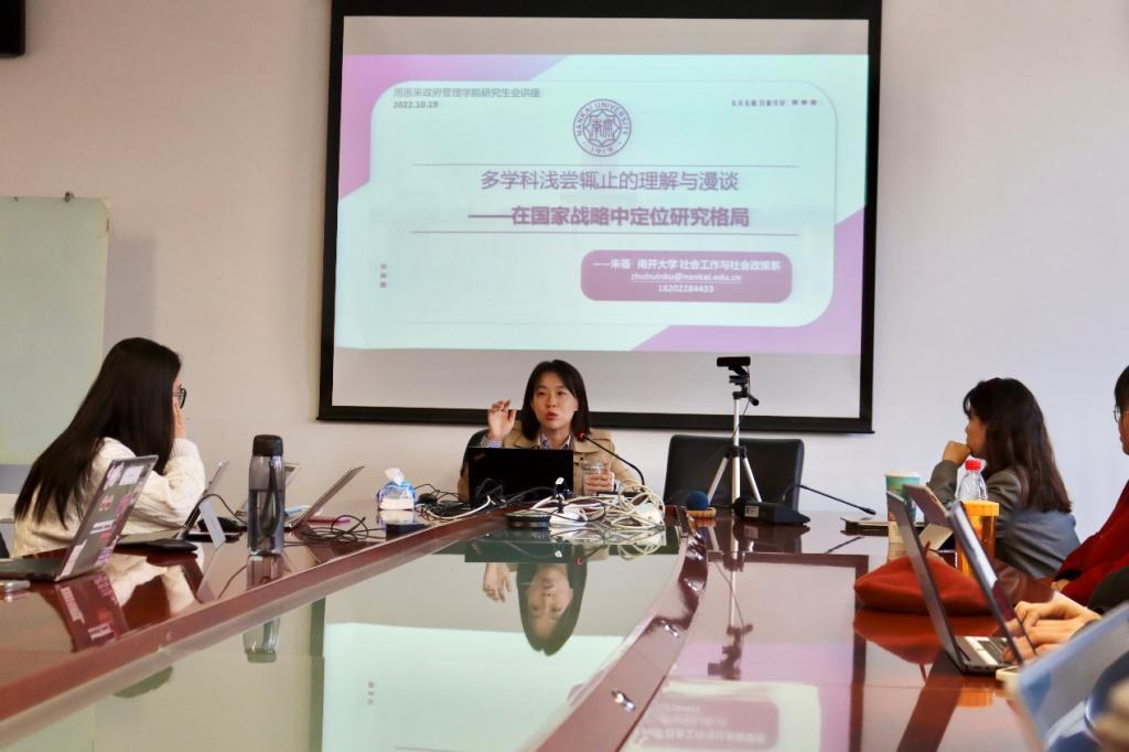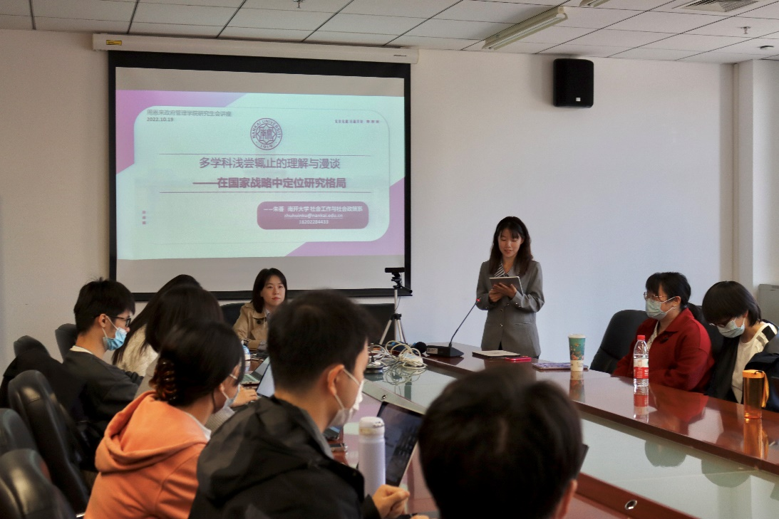 研究生会承办的“导师有约”系列学术讲座于学院325会议室严格按照防疫要求顺利开展。本学期邀请到的第一位导师,南开大学社会工作与社会政策系副教授、硕士生导师朱荟老师,为我们带来题为《在国家战略中定位研究——多学科浅尝辄止的理解与漫谈》的学术探讨。