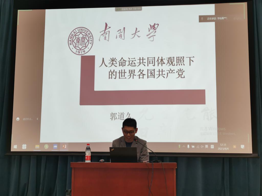 教授郭道久讲授主题为“人类命运共同体观照下的世界各国共产党”的专题党课,两学院共200余名入党积极分子参加。