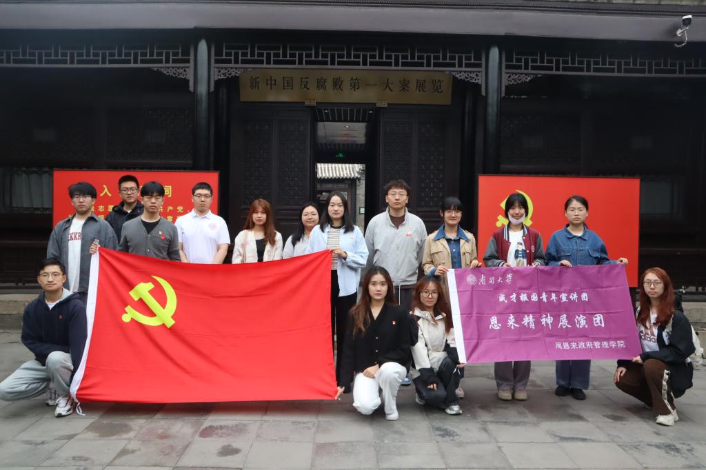 上午,学生党员与恩来精神展演团一同调研走访调研全国首批廉政教育基地——石家大院廉政教育基地。作为新中国反腐败第一大案——刘青山、张子善贪污腐败案的见证地,展览揭示了刘青山、张子善腐败案件真相,展示了党中央和天津市委开展党风廉政建设,与贪污腐败斗争到底的坚定决心。同学们在廉政教育基地现场“沉浸式”体验党纪教育,在讲解员的引导下认真聆听、仔细观看。教育基地现场通过视频、文字、图片、雕塑等多种形式,回顾了中国共产党百年纪律建设的历史进程、新时代全面从严治党取得的历史性成就以及管党治党、正风肃纪反腐的成功实践,为参观学生上了一堂生动的警示教育课,带来了强烈的思想冲击和心灵震撼,敲响了廉洁自律的警钟。