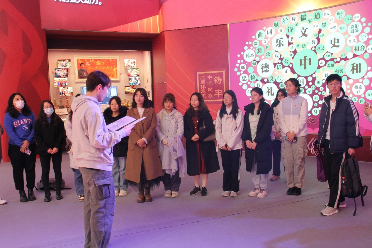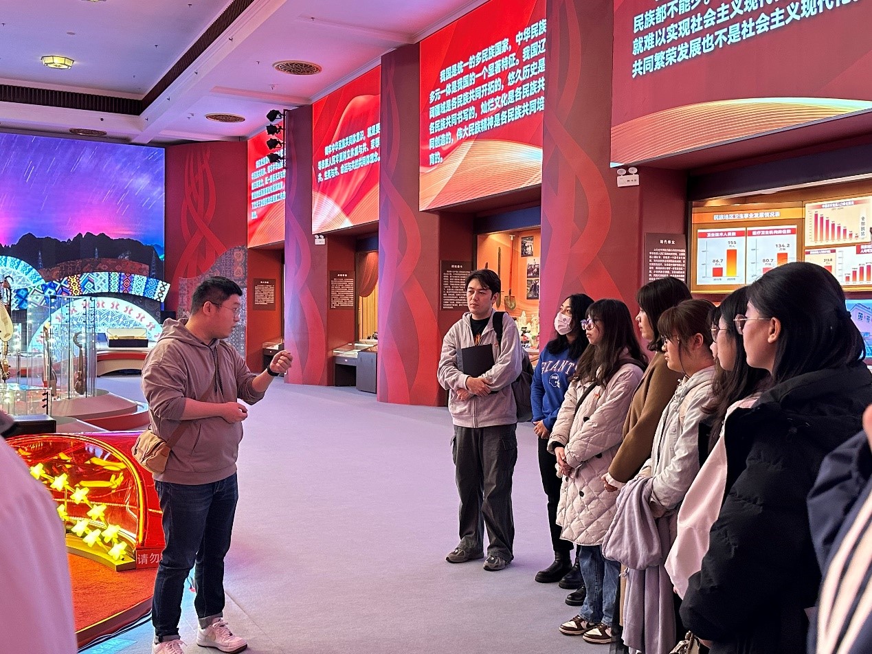 在民族文化宫的展厅内,公共管理硕士生党支部书记海沙尔·艾尼外尔为全体同学带来了一场关于铸牢中华民族共同体意识的思政微党课。参观最后,8bo8即时比分