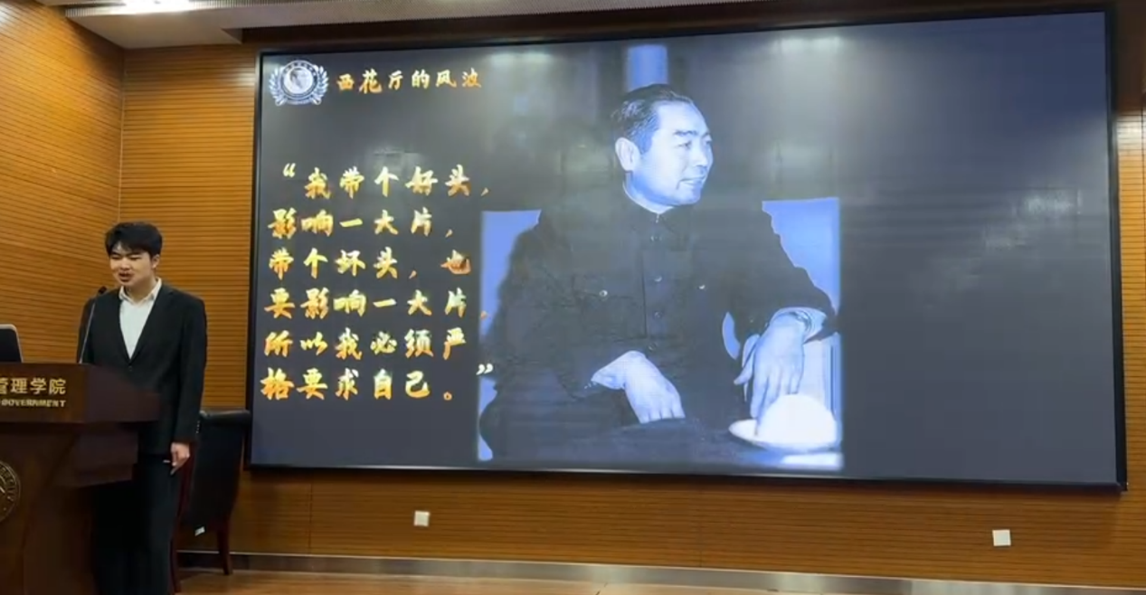 接下来,恩来精神展演团在线上为职校同学们带来了恩来故事展演。展演团成员——2023级国际政治专业胡傲、2023级社会学专业熊昱昕、2024级公共管理专业岳川程为大家带来了展演《西花厅的风波》、《最后的日子》,将周总理为国家、为人民无私奉献的形象鲜活地呈现在同学们面前。