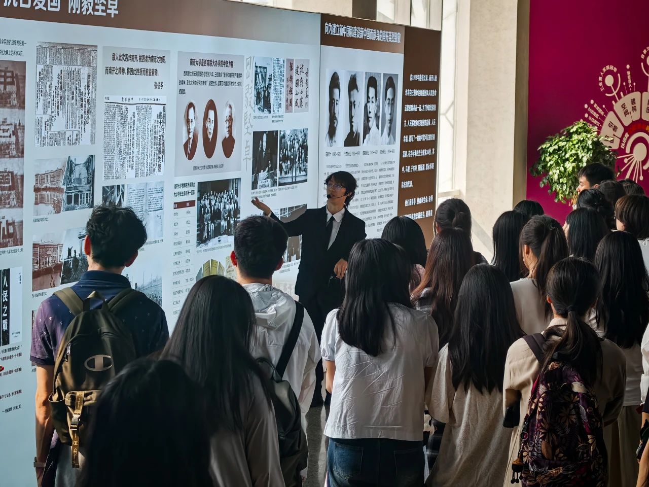 活动最后,两校师生共同参观南开大学百年校史展览,共同追溯校史中的红色基因与学术脉络。展览以“允公允能,日新月异”校训为核心,通过珍贵史料展现学校在不同历史时期与党和国家发展同频共振的历程。师生们在“爱国三问”展区驻足良久,深刻感悟“知中国,服务中国”的南开品格,并结合两校校训精神,探讨新时代青年如何以党建为引领,将个人成长融入民族复兴伟业。