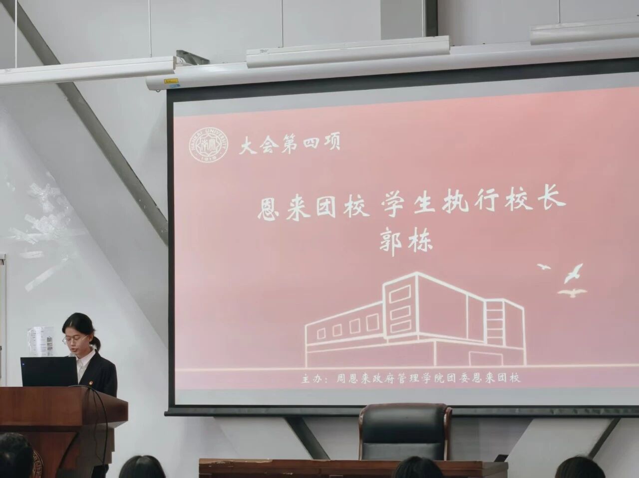 团委下属的培育先进团员和团学骨干的重要载体,致力于培养出素质全面、能力突出的共青团员和团学骨干,提高团员周政青年对学生团员、党员职责与使命的认识,培育其“公能”精神。为此,恩来团校在二十多年的发展中不断开拓创新,立足学生实际,响应时代需求,为学员设计了一系列优质团课,不断宣扬党的先进理论,培育周政学子的爱国情怀,引导周政青年塑造正确的价值观,成为时代需要的杰出人才。