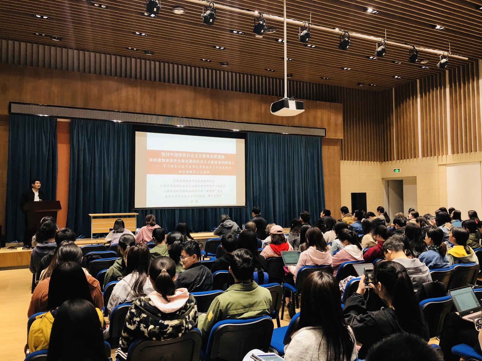 张健教授以1月17日习近平总书记到南开大学考察调研为背景,从“深刻领会贯彻习近平总书记考察南开大学时对高校建设发展提出的重要要求”和“以立德树人为根本贯彻落实全国教育大会精神”两方面展开,用生动的语言和鲜活的事例给在座的学员们讲授了一场精彩的党课。