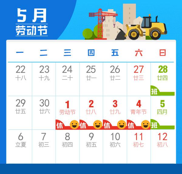 根据学校通知,2019年劳动节放假时间:5月1日~5月4日(星期三~星期六) ,共四天。 4月28日(星期日)上班、上课,安排星期四的课程。 5月5日(星期日)上班、上课,安排星期五的课程。