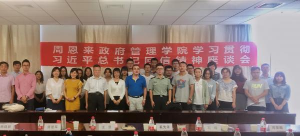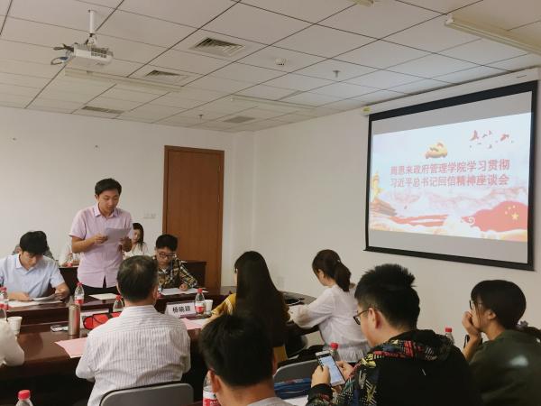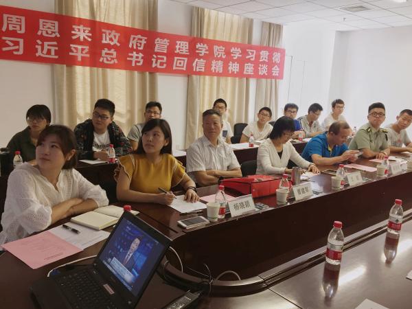 9月23日,习近平总书记给南开大学八名应征入伍学生回信,此事在我校师生中反响强烈。9月27日上午,政府学院组织召开学习贯彻习近平总书记回信精神座谈会。参加会议的有学院党委书记王慧,学院党委副书记兼副院长奚先来,学院党委兼职组织员曹建军,校党委武装部石瑶,学院参军学生代表邓亚超,以及各年级学生代表。会议由学院团委负责同志主持。