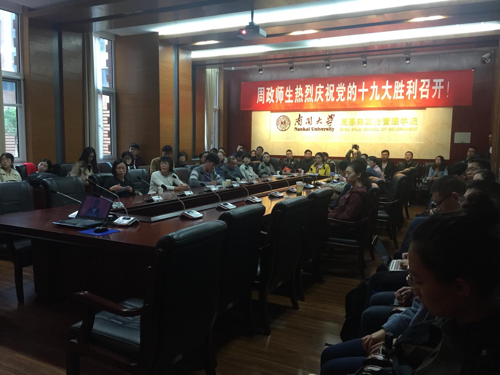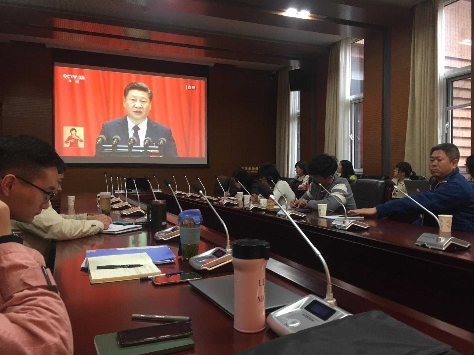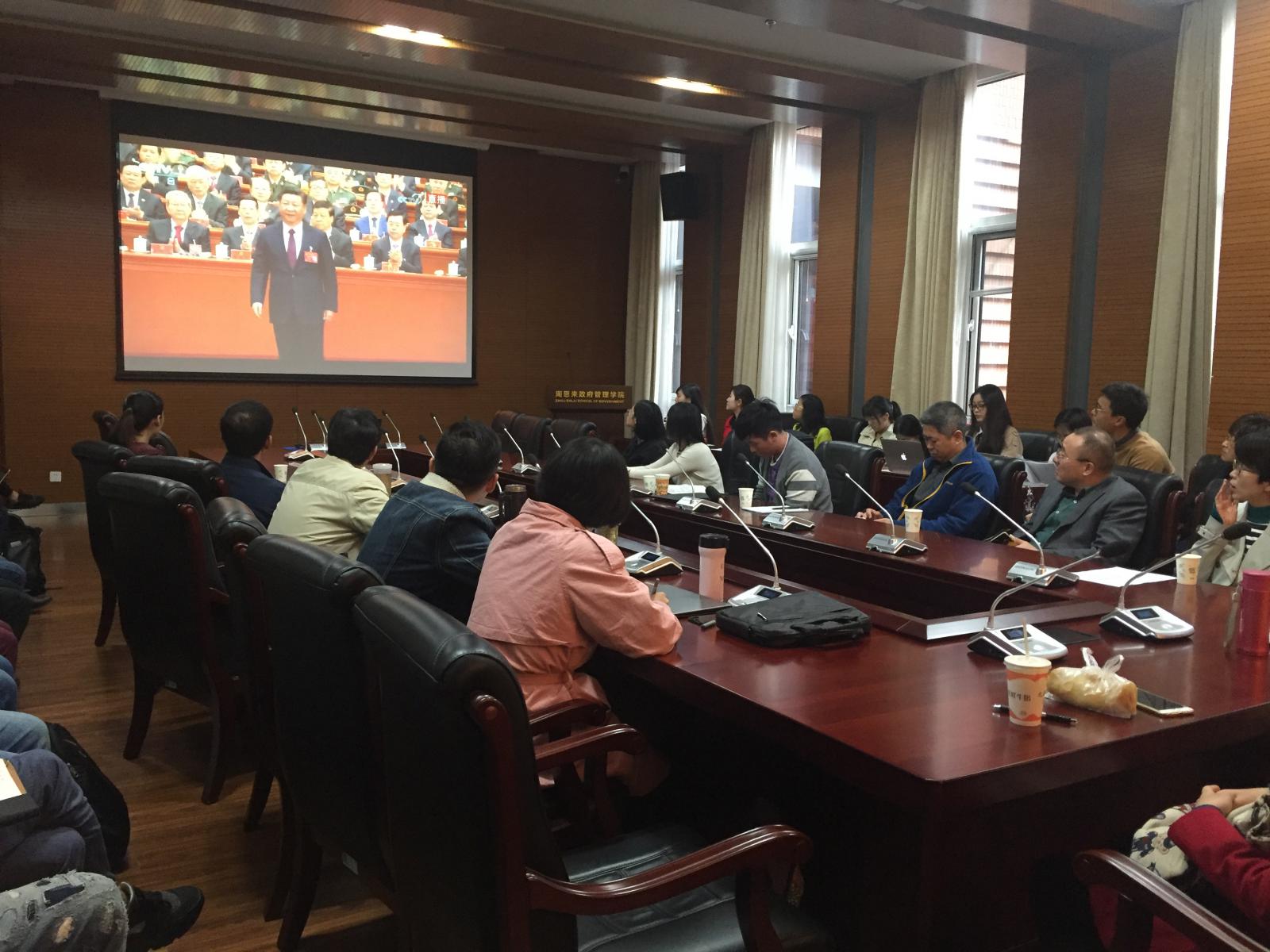 全体师生热切关注十九大。按照学校党委要求,学院党委把收听收看党的十九大开幕会议盛况当作一项重要的政治任务,落实到每一个基层支部、每一个党员和尽量广大的群众面。今天,学院广大师生员工在津南校区学院大楼144会议室集体收听收看,认真学习领会大会精神。在校学院班子成员、全体行政干部、各支部支委也在会场收看。