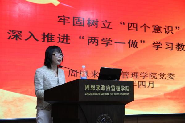 会上,王慧书记首先就本次宣讲的背景和意义进行了说明。她指出,牢固树立“四个意识”是贯彻十八届六中全会的根本遵循,是加强党内政治文化建设的根本方针。王慧书记从进一步认识牢固树立“四个意识”的重要意义、牢固树立和自觉践行“四个意识”、以全面从严治党的新成效净化政治生态三大方面,对“牢固树立‘四个意识’”主题作了详细解读。王慧书记指出,牢固树立“四个意识”是贯彻党的十八届六中全会精神的根本要求,是净化党内政治生态的根本遵循,是加强党内政治文化建设的根本指针。要深刻认识牢固树立“四个意识”的重要意义,以思想意识作为行动指针,以清醒认识引领坚定实践。她要求学院教师要结合工作实际,落实全国高校思想政治工作会议精神,对接国家新一轮教育、科技、人才等规划的改革导向,实现学院特色发展,为学校“双一流”建设做出贡献。