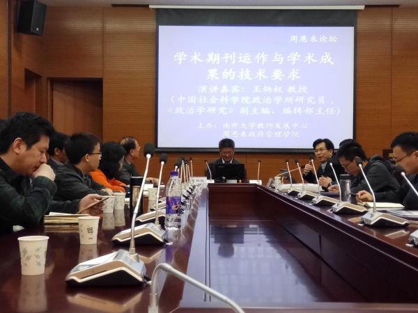 的邀请,中国社会科学院政治学研究所研究员、《政治学研究》副主编、编辑部主任王炳权做客周恩来论坛,为师生们做了题为“学术期刊运作与学术成果的技术要求”的讲座。讲座由政府管理学院的吴志成院长主持,政治学系主任程同顺教授和学院青年教师以及博士研究生参加。