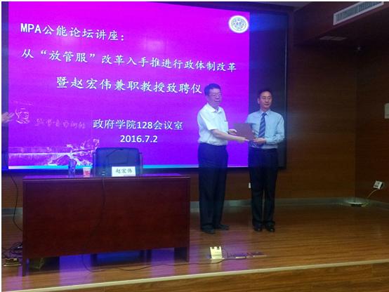 此外,赵宏伟主任以“从放管服改革入手 推进行政体制改革”为主题,为到场师生带来讲座。讲座阐述了天津“十个一”改革的主要内容以及关于行政服务中心和行政审批运行的内容,并从围绕简政放权、加快构建权责清晰、分工合理、权责一致、运转高效、法制保障的机构职能体系,围绕放管结合、加快构建企业守信、执法规范、监管有效、廉洁高效的体制机制等方面探讨了行政审批管理改革的生长点。讲座期间,赵宏伟主任对同学们提出的的问题进行了精彩解答,并进行了深入交流。