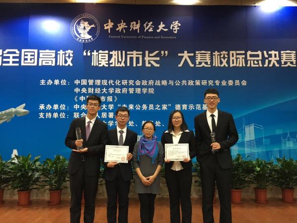2013级社会学的陈怡、2012级行政管理的李思佳、2012级政治学与行政学的赵志远和2014级城市管理专业的谢子涵、张刘引等五名学生组成“南开大学思源队”,由城市管理专业张丽梅老师全程指导,参加比赛。我校代表队选择《基于微博大数据的政府与公众关于突发事件舆论互动机制研究——以天津“8·12大爆炸”为例》为议题,聚焦了应急管理中政府和公众的信息内容错位、信息时滞等问题,提出了相应的解决方法。在总决赛现场,代表队通过模拟新闻发布会的方式夸张地展示出目前应急管理中公众和政府信息传递之间所存在的问题;然后由“学生市长”推到“信息隔板”,并表示“我们希望政府与媒体,政府与公众之间的信息隔板能够消失。”模拟表演后,青岛市崂山区区委书记齐家滨向“学生市长”提问,我校 “学生市长”灵活应对,赛场气氛紧张激烈,答辩效果出奇制胜。