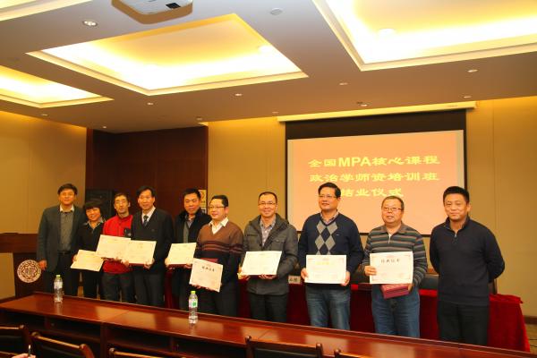 在分组讨论汇报环节,来自8个小组的教师代表分别发言,就本组开展讨论的情况进行了汇报展示,孙玉栋副秘书长听取了汇报,并对汇报中各组所提出的一些问题进行了回应和交流。结业仪式上,孙玉栋教授和孙涛教授共同为参训教师代表颁发毕业证书,至此,为期3天的2014年第1期全国MPA核心课程“政治学”师资培训班画上圆满的句号。