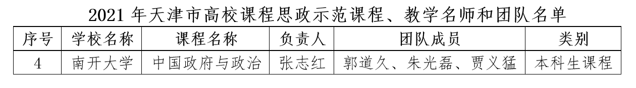 据悉,这是自“中国政府与政治”本科生课程被教育部认定为首批“国家级一流本科课程”之后获得的又一重要荣誉。根据《教育部办公厅关于开展课程思政示范项目建设工作的通知》(教高厅函[2021]11号)精神,入选2021年天津市课程思政示范课程相应授课教师、团队直接认定为2021年天津市高校课程思政教学名师和教学团队。