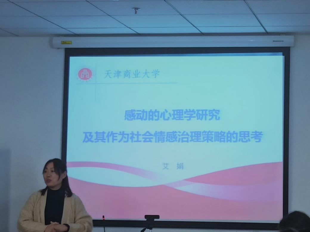 天津商业大学法学院艾娟副教授在“感动的心理学研究及其作为社会情感治理策略的思考”的主旨发言中,从艺术、文学、社会学、伦理学、传播学等不同学科视角出发,对“感动”这种特殊且复杂的情感状态进行了深入的思考,认为其可以作为一种社会情感治理的策略,可以进一步激发人们所共享的公共情感、更高水平的温暖感、促进社会正向情感的最大化、优化管理社会关系,助力良好社会心态建设。