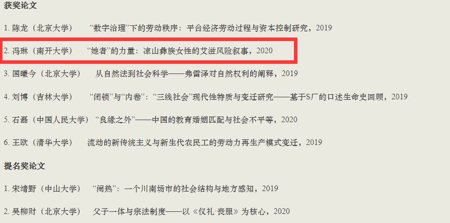 社会学系助理研究员冯琳博士的《“她者”的力量:凉山彝族女性的艾滋风险叙事》荣获优秀博士论文奖。