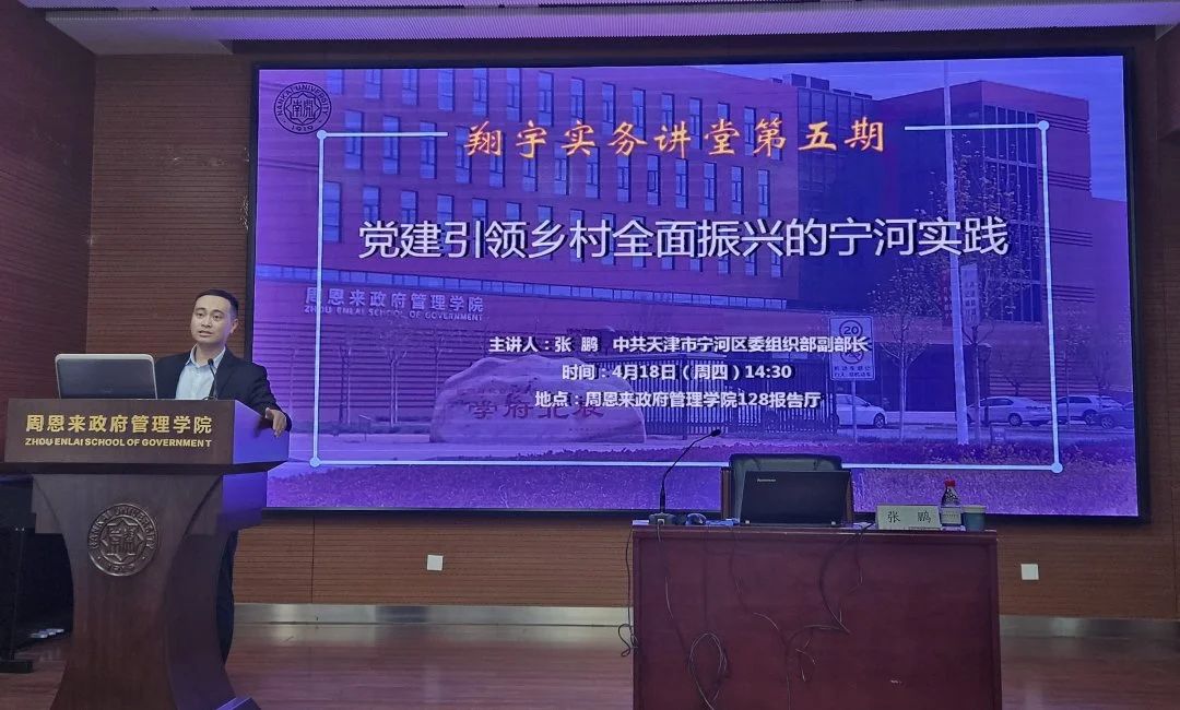 “翔宇”实务讲堂暨中国经验进校园讲座第5期开讲。中共天津市宁河区委组织部副部长张鹏同志受邀在南开大学做题为“党建引领乡村全面振兴的宁河实践”的讲座。政府学院党委书记王慧,副院长、中国政府发展联合研究中心副主任吴晓林教授,学院团委书记王修彦出席研讨。会议由副院长吴晓林教授主持,学院200多名师生参加。
