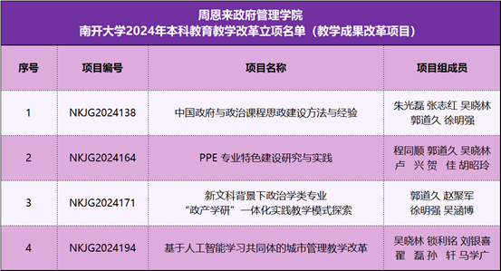 获得四项教学成果改革项目立项。其中,由朱光磊教授担任首席专家的《中国政府与政治课程思政建设方法与经验》,由程同顺教授担任首席专家的《PPE 专业特色建设研究与实践》,由郭道久教授担任首席专家的《新文科背景下政治学类专业“政产学研”一体化实践教学模式探索》,由吴晓林教授担任首席专家的《基于人工智能学习共同体的城市管理教学改革》均获得立项。