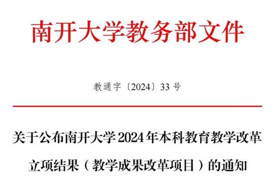 6月4日,南开大学教务部公布《南开大学2024年本科教育教学改革立项名单(教学成果改革项目)》。根据《关于开展 2024 年本科教育教学改革立项工作的通知》(教通字〔2024〕2 号)安排,经各教学单位申报、教务部形式审查、专家组评审、拟立项名单公示,确定立项教学成果改革项目 88 项。