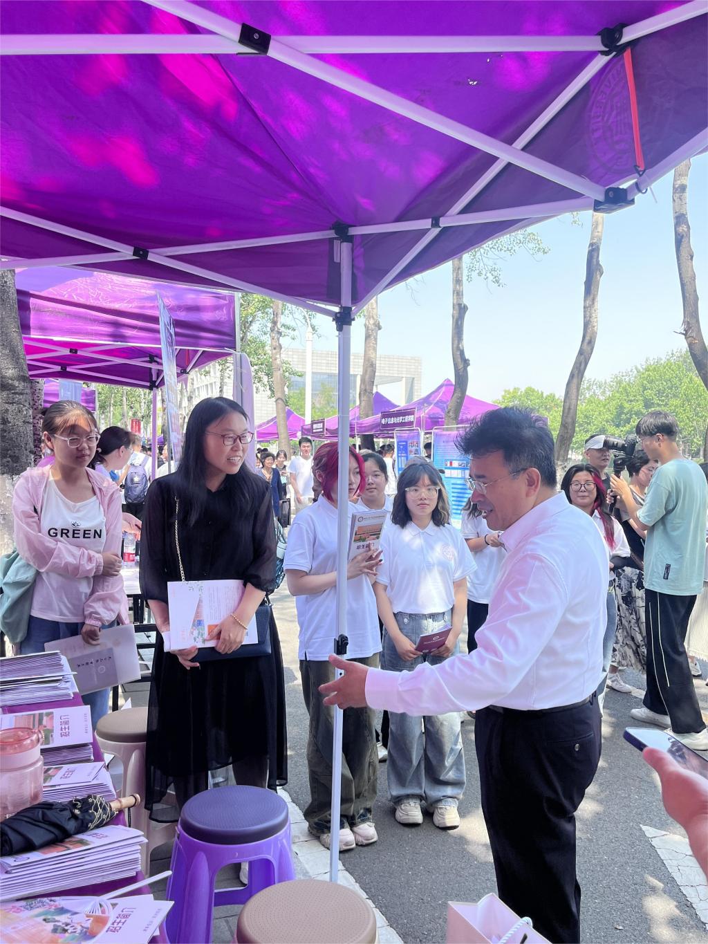展位,与师生志愿者及前来咨询的考生、家长亲切交谈。