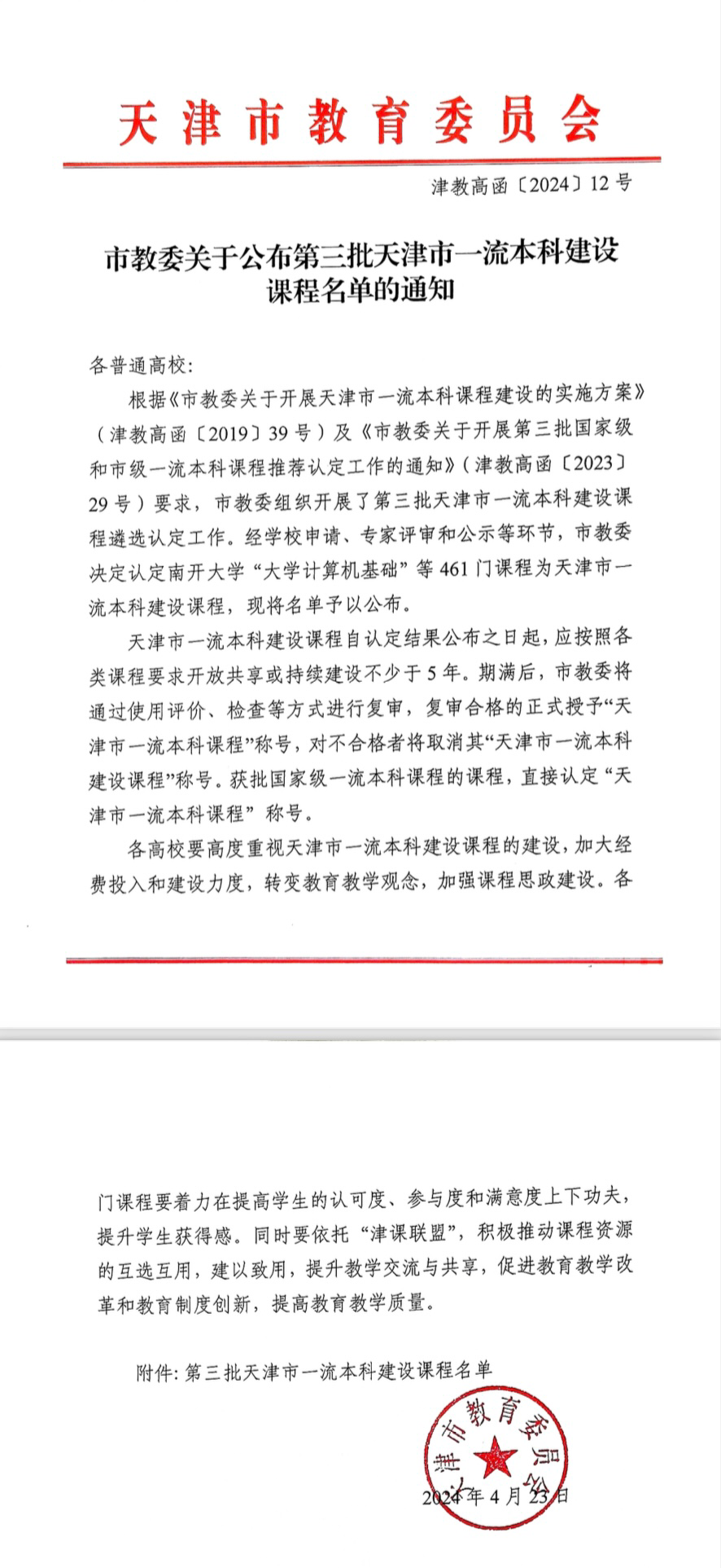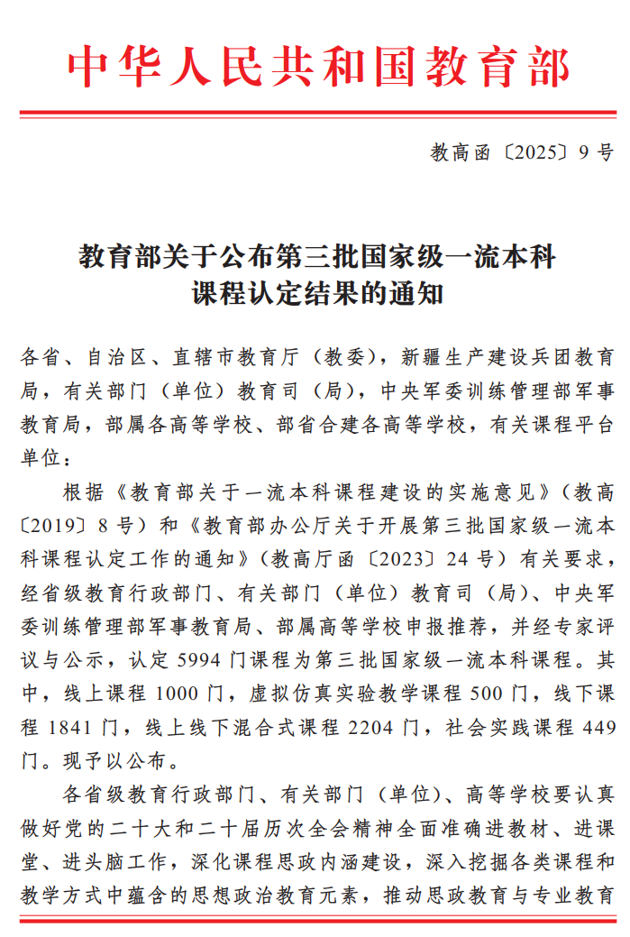 日前,教育部发布了《教育部关于公布第三批国家级一流本科课程认定结果的通知》(教高函〔2025〕9号)。南开大学8bo8即时比分