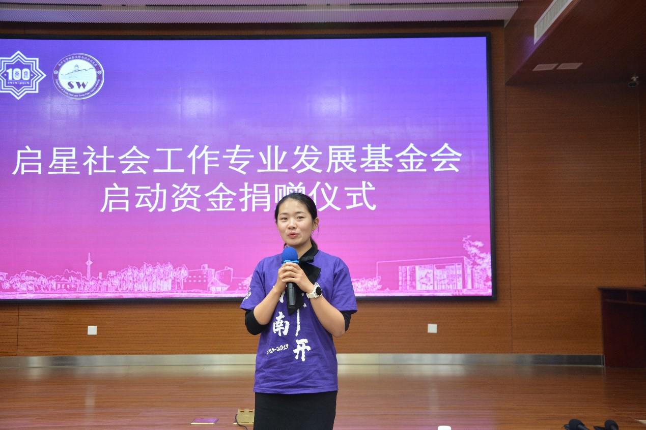 致辞发言结束后举行了“启星社会工作发展基金”的启动仪式。第三届周恩来班2005级社会工作本科班级发起建立基金的倡议,班级代表阿依古丽以参与汶川地震灾区重建专业化服务的经历为例呈现了建立社会工作基金的重要作用。吴帆教授简要介绍了基金成立的流程,表达了希望基金用于学生奖学助学、专业服务支持和学科建设的殷切期望。2012级本科毕业生朱功伟在启动仪式上表示希望能通过自己的努力为在校同学们创造更多的机会。