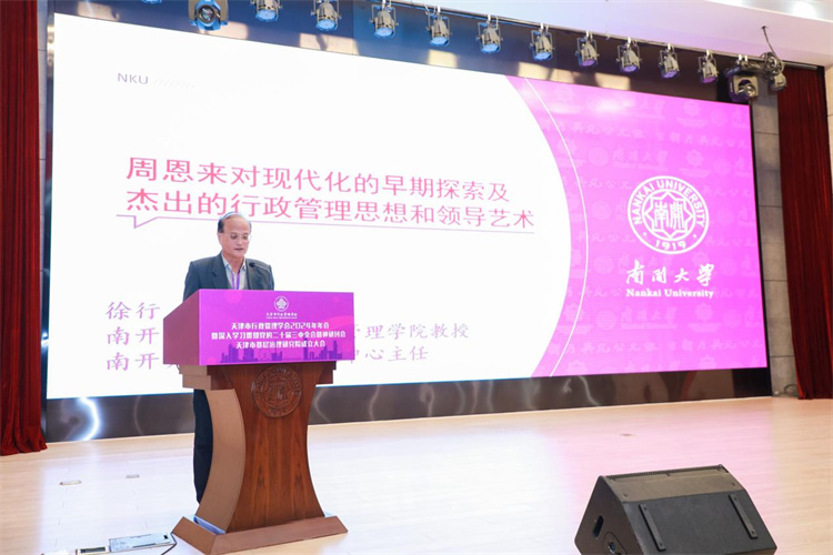 南开大学周恩来研究中心主任徐行,全国政协委员、中国人事科学研究院院长、中国行政管理学会副会长余兴安,中共天津市委党校副校长丛屹,天津市社会科学界联合会党组成员、专职副主席张再生分别围绕“周恩来对中国现代化的早期探索及杰出的行政管理思想与领导艺术”“数智赋能,加快推进城市治理现代化”“构建超大城市智慧治理体系的几点思考”作主题发言。天津市行政管理学会副会长兼秘书长张霁星主持主题发言环节。